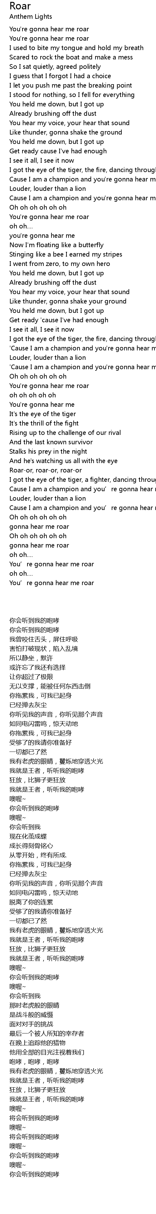 | [02:28.250] | ' Cause I am a champion and you' re gonna hear me ROAR |
