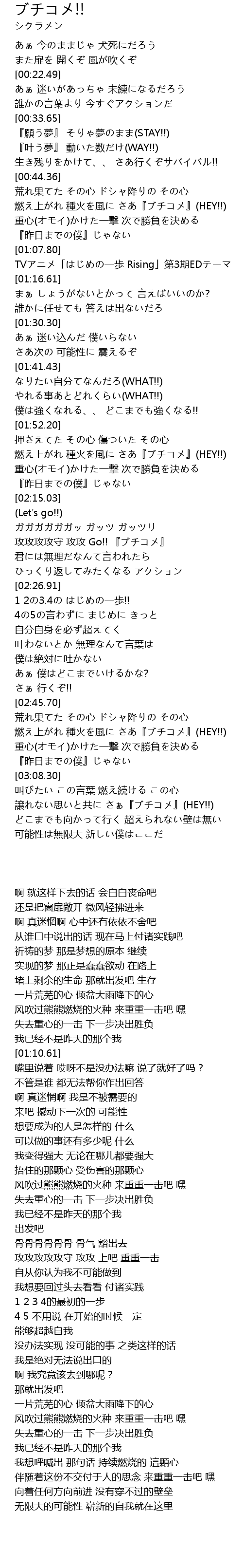 | [01:58.43] | 燃え上がれ 種火を風に さあ『ブチコメ』(HEY!!) |