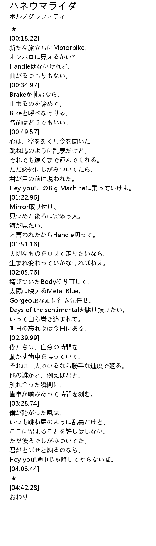| [00:20.22] | 新たな旅立ちにMotorbike、 |