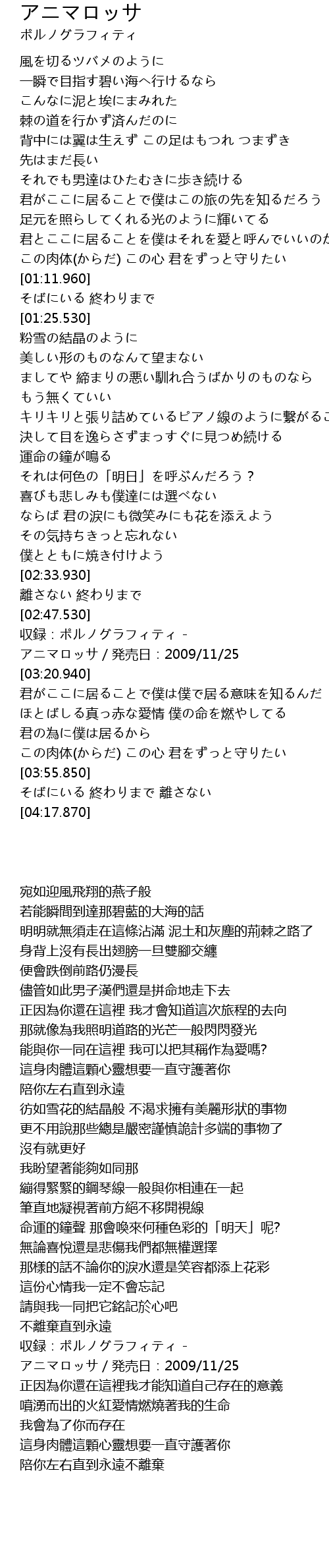 | [02:49.530] | 収録:ポルノグラフィティ - アニマロッサ/発売日:2009/11/25 |