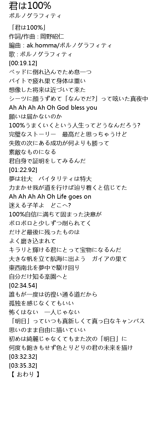 | [00:01.12] | 「君は100%」 |