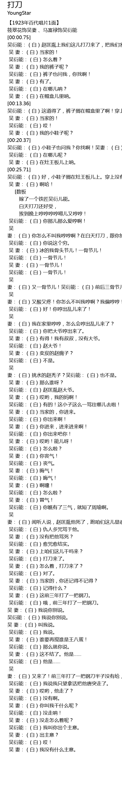 | [02:26.33] | 吴 妻:(白)又来了!前三年打了一把钢刀半子没有给,怎么又来打刀来了,这小子没安着好脸面,你可要留点神呐! |