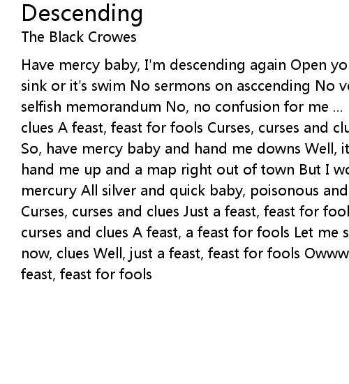 Have mercy baby, I'm descending again Open your eyes baby, 'cause this time it's sink or it's swim No sermons on asccending No verdict on deceit I have no selfish memorandum No, no confusion for me ... Not for me Curses, curses and clues A feast, feast for fools Curses, curses and clues A feast, feast for fools So, have mercy baby and hand me downs Well, it was just a few years ago You'd hand me up and a map right out of town But I would let it slide, slide like mercury All silver and quick baby, poisonous and deadly ... I'm so deadly Curses, curses and clues Just a feast, feast for fools Tell ya now, curses, curses and clues A feast, a feast for fools Let me say curses, let me tell ya now, clues Well, just a feast, feast for fools Owww, curses, curses and clues A feast, feast for fools |