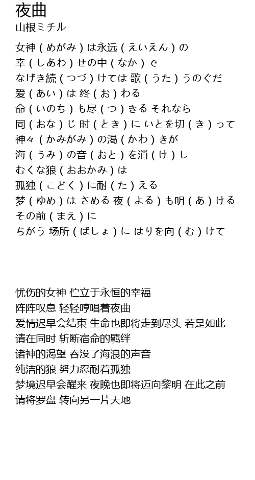 | [00:16.570] | 女神(めがみ)は永远(えいえん)の 幸(しあわ)せの中(なか)で |