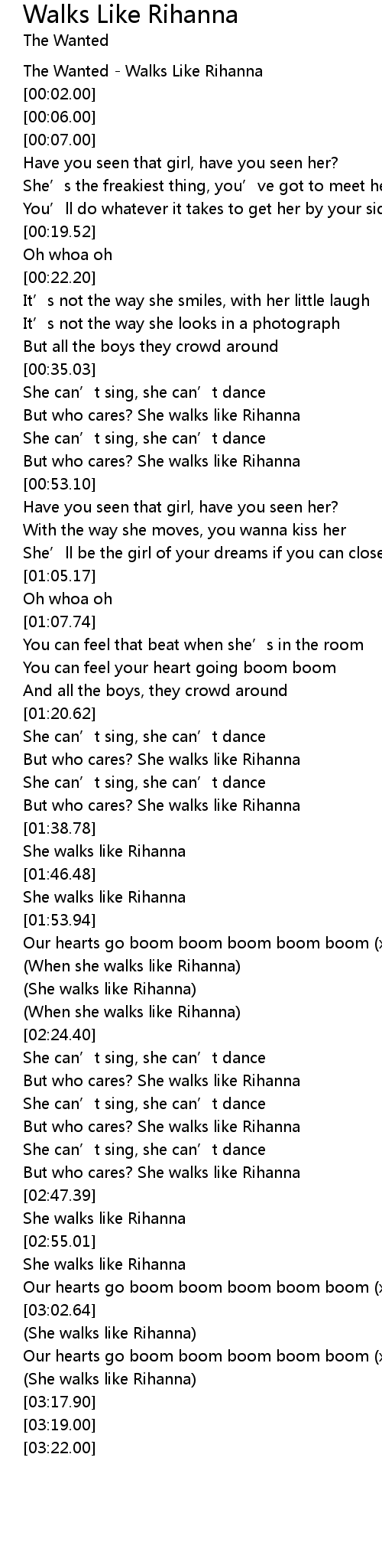 | [02:36.19] | But who cares? She walks like Rihanna |