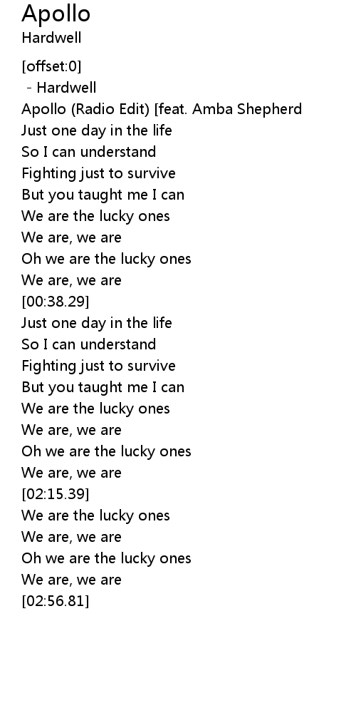 | [00:00.92]Apollo (Radio Edit) [feat. Amba Shepherd] | - Hardwell |