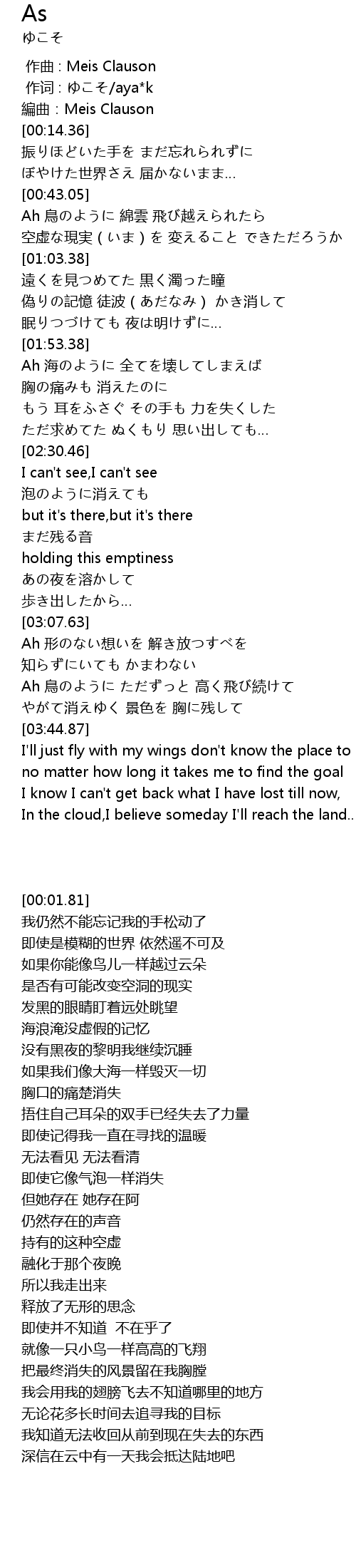 | [03:25.49] | Ah 鳥のように ただずっと 高く飛び続けて |