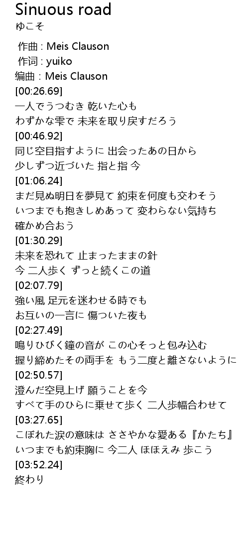 | [03:37.65] | いつまでも約束胸に 今二人 ほほえみ 歩こう |