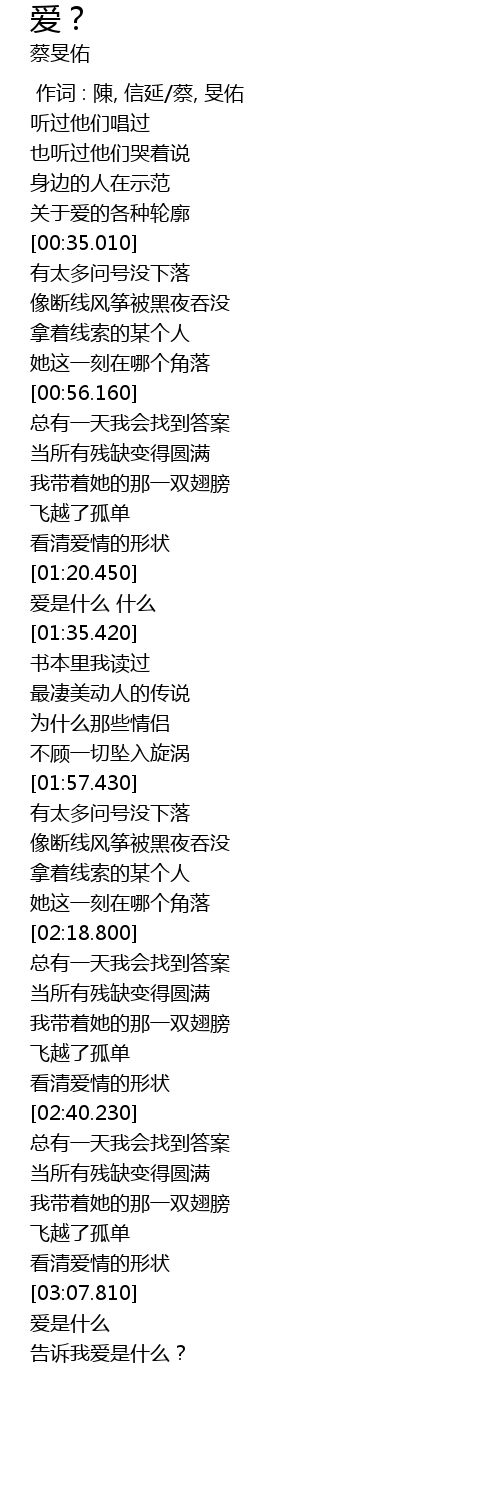 | [03:13.640] | gào sù wǒ ài shì shén me? |