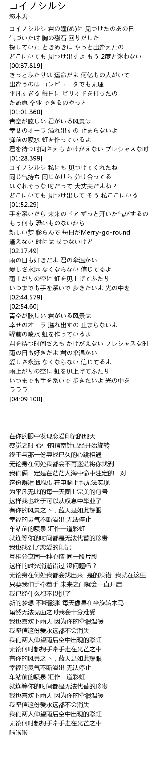 | [00:14.409] | コイノシルシ 君の瞳(め)に 见つけたのあの日 |