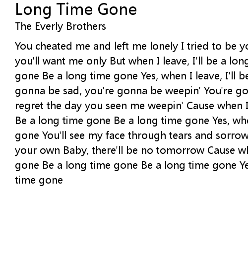 You cheated me and left me lonely I tried to be your very own There'll be a day you'll want me only But when I leave, I'll be a long time gone Be a long time gone Be a long time gone Yes, when I leave, I'll be a long time gone You're gonna be sad, you're gonna be weepin' You're gonna be blue and all alone You'll regret the day you seen me weepin' Cause when I leave, I'll be a long time gone Be a long time gone Be a long time gone Yes, when I leave, I'll be a long time gone You'll see my face through tears and sorrow You'll miss the love you called your own Baby, there'll be no tomorrow Cause when I leave, I'll be a long time gone Be a long time gone Be a long time gone Yes, when I leave, I'll be a long time gone |