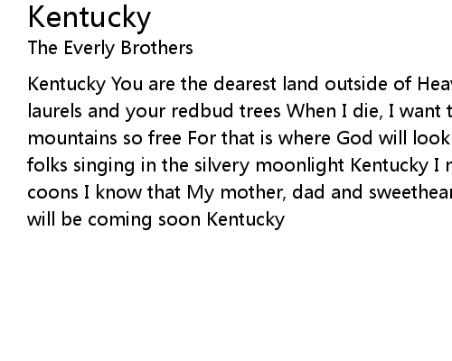 | Kentucky You are the dearest land outside of Heaven to me Kentucky I miss your laurels and your redbud trees When I die, I want to rest upon your graceful mountains so free For that is where God will look for me Kentucky I miss the old folks singing in the silvery moonlight Kentucky I miss the hound dogs chasin’ coons I know that My mother, dad and sweetheart are waiting for me Kentucky I will be coming soon Kentucky |