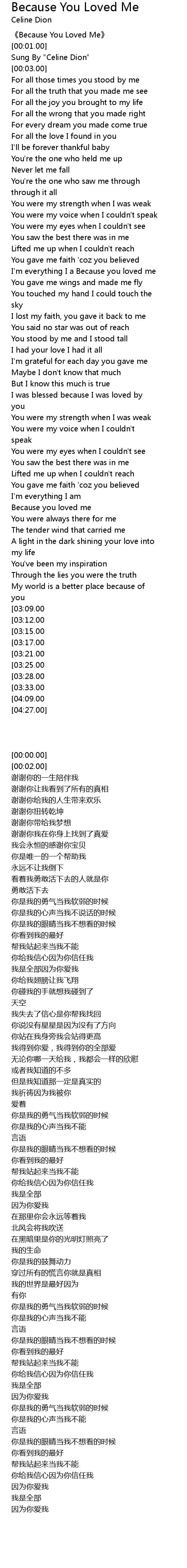 | [00:00.00] | 《Because You Loved Me》 |