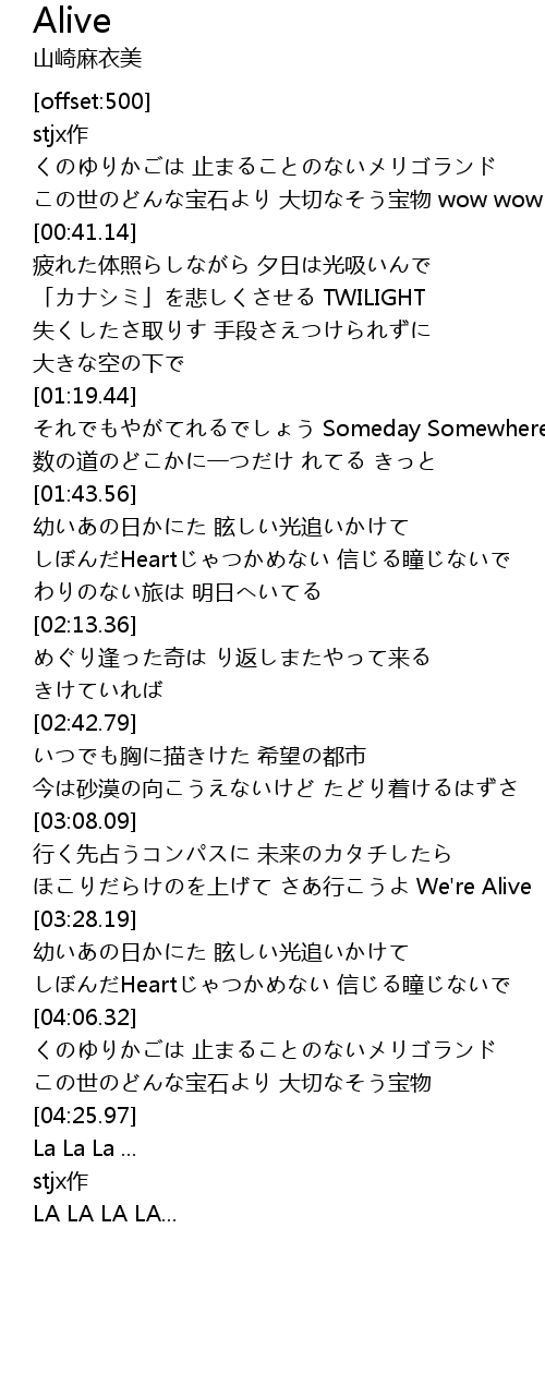 | [03:17.99] | ほこりだらけのを上げて さあ行こうよ We're Alive |