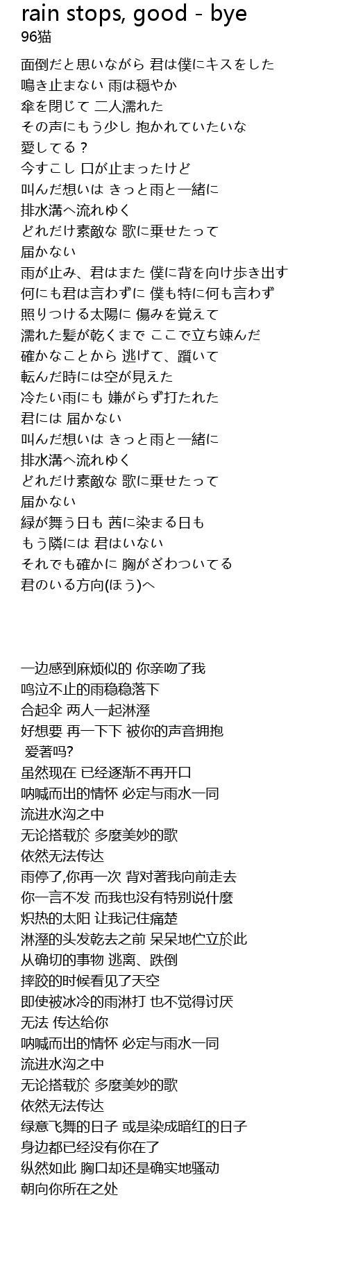 | [01:19.61] | 叫んだ想いは きっと雨と一緒に |