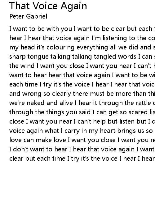 I want to be with you I want to be clear but each time I try it's the voice I hear I hear that voice again I'm listening to the conversation judge and jury in my head it's colouring everything all we did and said and still I head that sharp tongue talking talking tangled words I can sense the danger just listen to the wind I want you close I want you near I can't help but listen but I don't want to hear hear that voice again I want to be with you I want to be clear but each time I try it's the voice I hear I hear that voice again I'm hearing right and wrong so clearly there must be more than this it's only in uncertainty that we're naked and alive I hear it through the rattle of a streetcar hear it through the things you said I can get so scared listen to the wind I want you close I want you near I can't help but listen but I don't want to hear hear that voice again what I carry in my heart brings us so close or so far apart only love can make love I want you close I want you near I can't help but listen but I don't want to hear I hear that voice again I want to be with you I want to be clear but each time I try it's the voice I hear I hear that voice again |