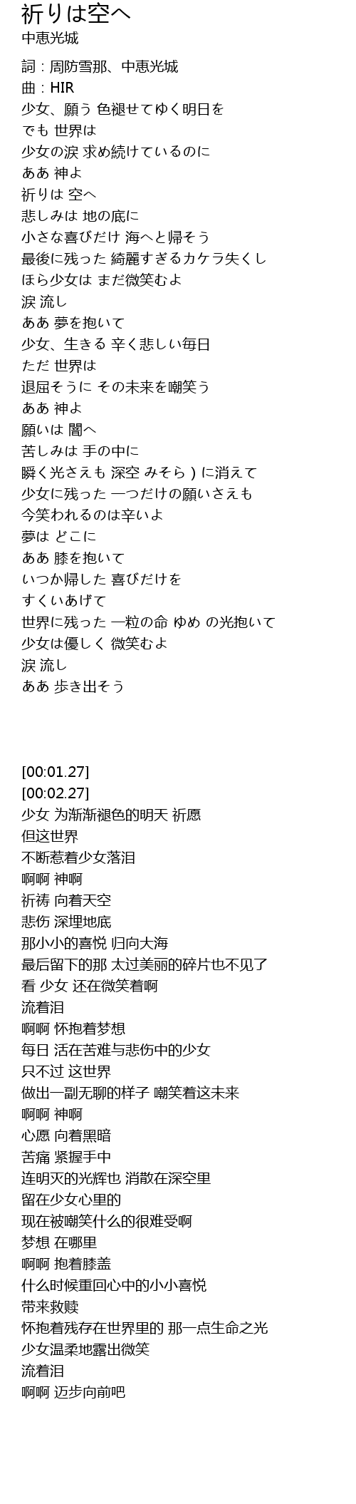 | [00:01.27] | 詞:周防雪那、中恵光城 |