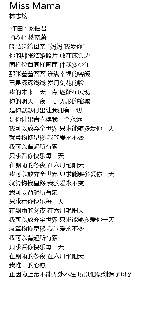 | [00:10.500] | xiao hui song gei mu qin " ma ma wo ai ni" |
