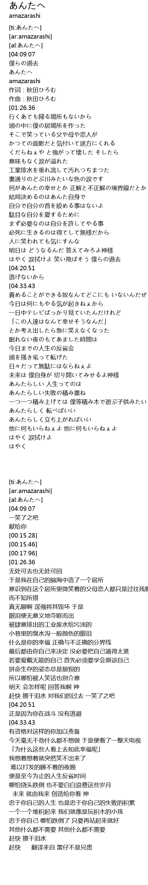 | [00:00.41][04:09.07][05:12.69] | 赶快 擦干泪水 对我们的过去 一笑了之吧 |