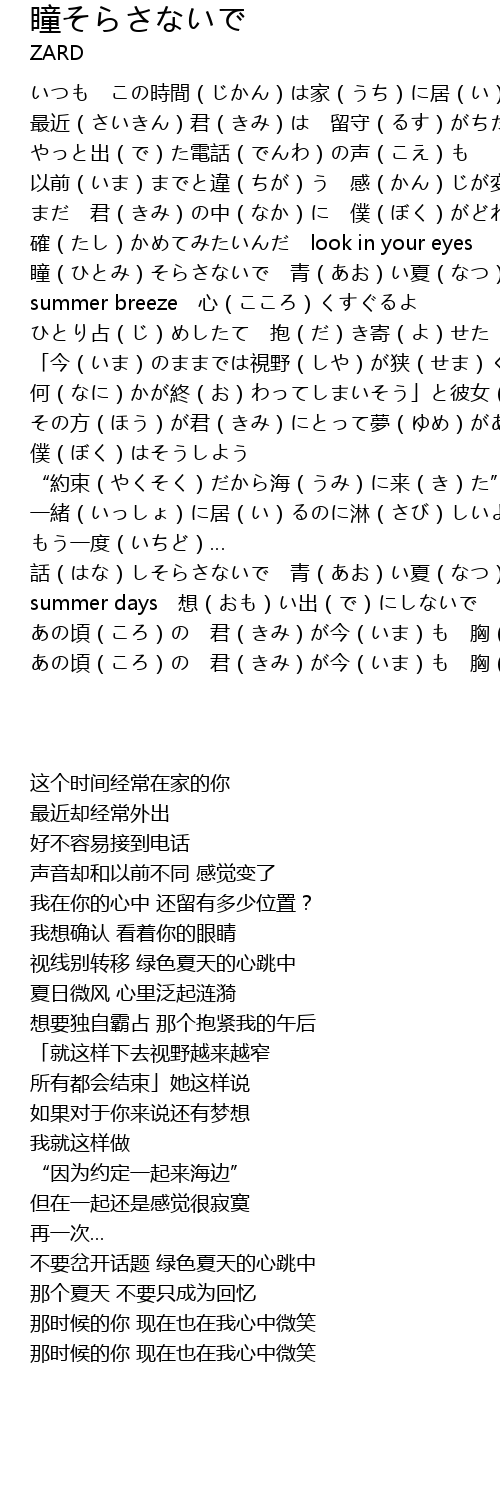 | [01:35.99] | 瞳(ひとみ)そらさないで 青(あお)い夏(なつ)のトキメキの中(なか)で |