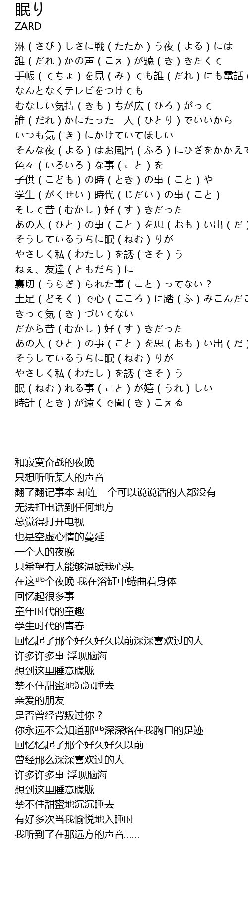 | [03:54.97] | 眠(ねむ)れる事(こと)が嬉(うれ)しい |