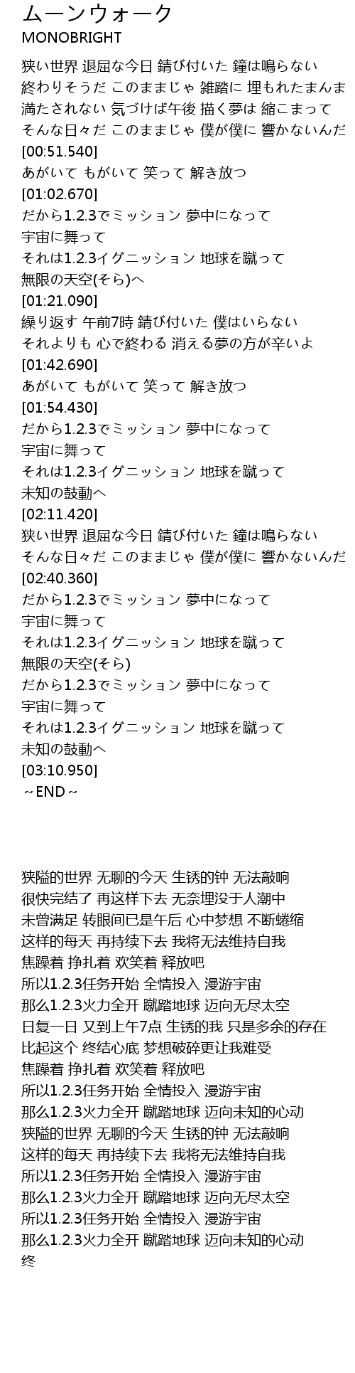 | [02:54.170] | だから1.2.3でミッション 夢中になって 宇宙に舞って |