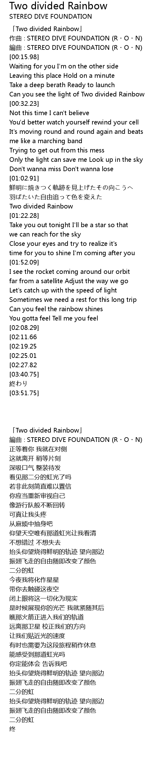 | [03:14.83][02:25.01] | Two divided Rainbow |
