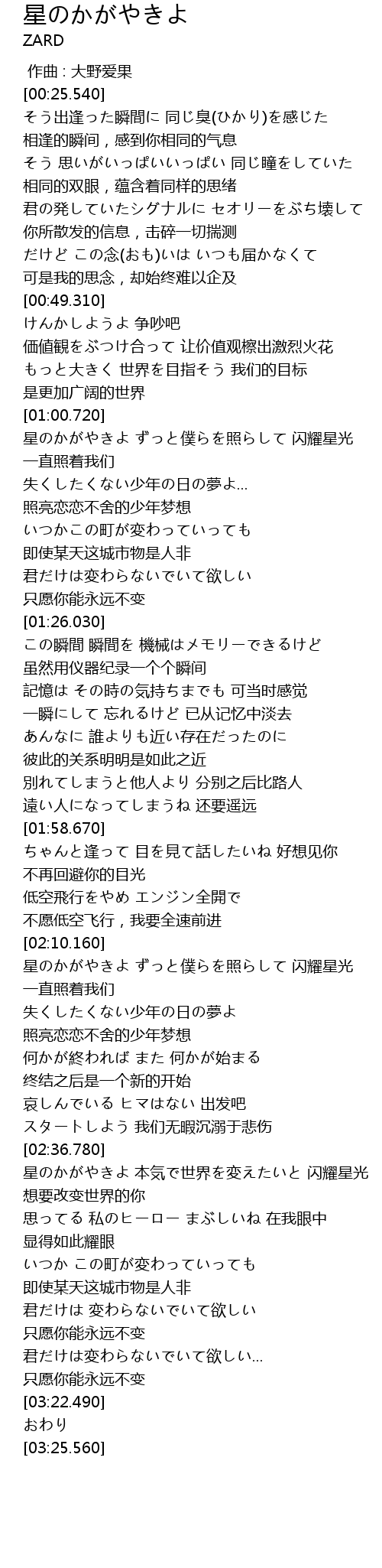 | [02:11.510] | 星のかがやきよ ずっと僕らを照らして 闪耀星光 一直照着我们 |
