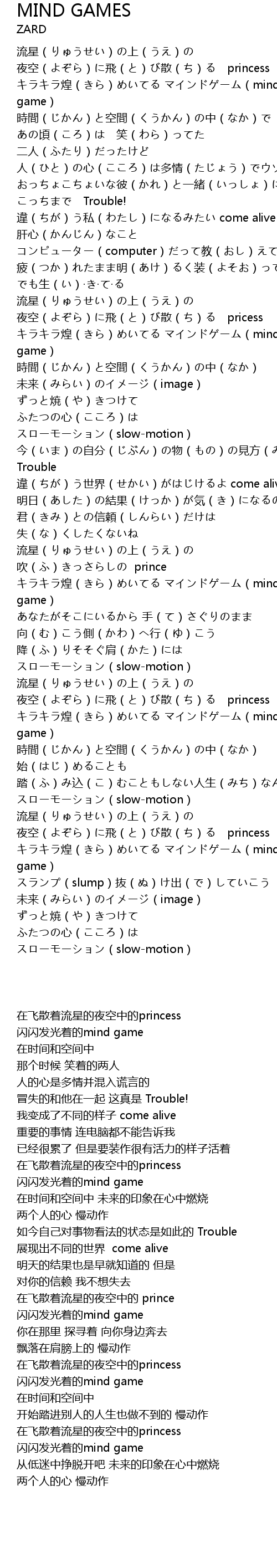 | [00:23.47] | キラキラ煌(きら)めいてる マインドゲーム(mind game) |