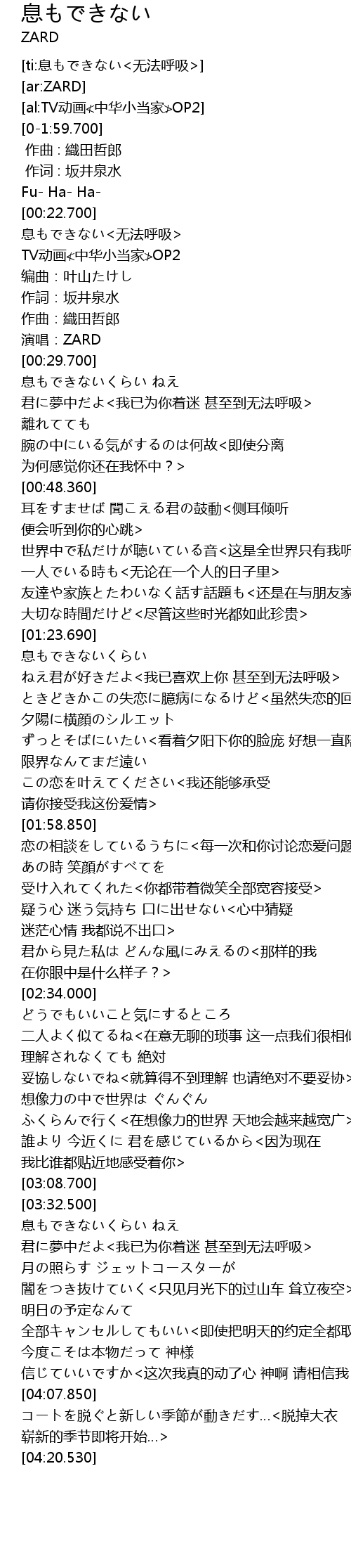 | [03:34.500] | 息もできないくらい ねえ 君に夢中だよ<我已为你着迷 甚至到无法呼吸> |