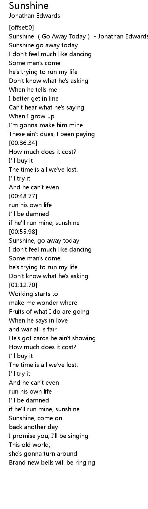 | [00:00.21] | Sunshine Go Away Today Jonathan Edwards |
