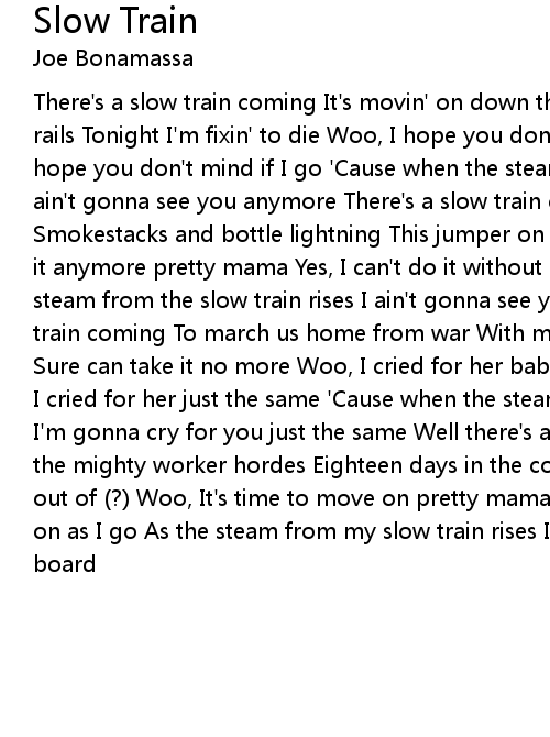 There's a slow train coming It's movin' on down the line Steel wheels on iron rails Tonight I'm fixin' to die Woo, I hope you don't mind pretty mama Woo-hoo, hope you don't mind if I go 'Cause when the steam from the slow train rises I ain't gonna see you anymore There's a slow train coming Coming right on time Smokestacks and bottle lightning This jumper on the line Woo, I can't do without it anymore pretty mama Yes, I can't do it without it anymore 'Cause when the steam from the slow train rises I ain't gonna see you anymore There's a slow train coming To march us home from war With my leather boots and my haversack Sure can take it no more Woo, I cried for her baby when I saw you there Woo-hoo, I cried for her just the same 'Cause when the steam from the slow train rises I'm gonna cry for you just the same Well there's a slow train coming Carrying the mighty worker hordes Eighteen days in the cotton field Enough to put a man out of (?) Woo, It's time to move on pretty mama Woo-hoo, Yes it's time to move on as I go As the steam from my slow train rises It's time for me to get on board |