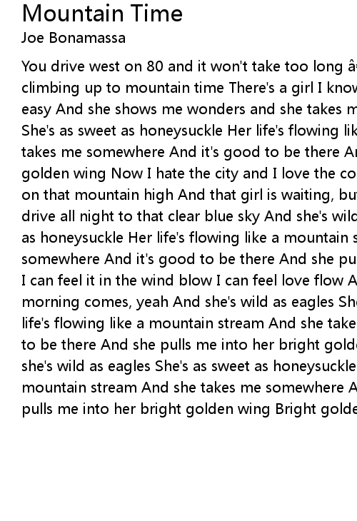| You drive west on 80 and it won' t take too long Til the road starts climbing up to mountain time There' s a girl I know there, she lives free and easy And she shows me wonders and she takes my mind And she' s wild as eagles She' s as sweet as honeysuckle Her life' s flowing like a mountain stream And she takes me somewhere And it' s good to be there And she pulls me into her bright golden wing Now I hate the city and I love the country And I love that feeling on that mountain high And that girl is waiting, but she won' t wait too long So I drive all night to that clear blue sky And she' s wild as eagles She' s as sweet as honeysuckle Her life' s flowing like a mountain stream And she takes me somewhere And it' s good to be there And she pulls me into her bright golden wing I can feel it in the wind blow I can feel love flow And I' ll be there when the morning comes, yeah And she' s wild as eagles She' s as sweet as honeysuckle Her life' s flowing like a mountain stream And she takes me somewhere And it' s good to be there And she pulls me into her bright golden wing Bright golden wing And she' s wild as eagles She' s as sweet as honeysuckle Her life' s flowing like a mountain stream And she takes me somewhere And it' s good to be there And she pulls me into her bright golden wing Bright golden wing |