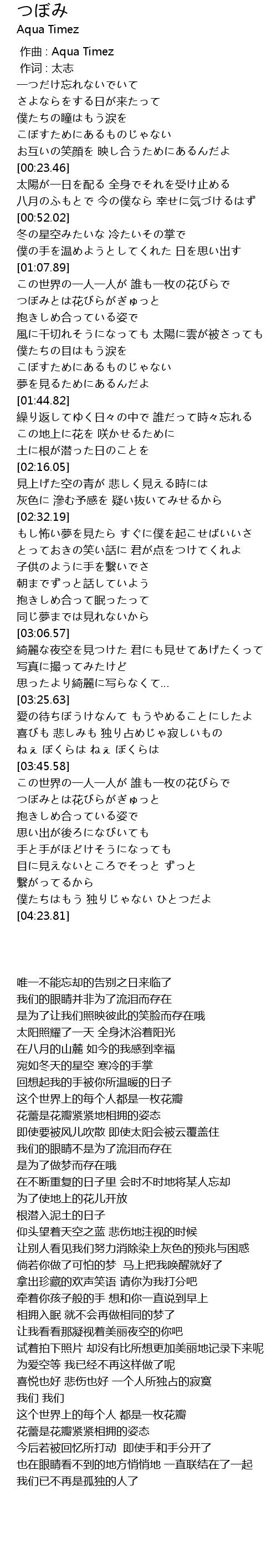 | [03:53.25] | つぼみとは花びらがぎゅっと 抱きしめ合っている姿で |