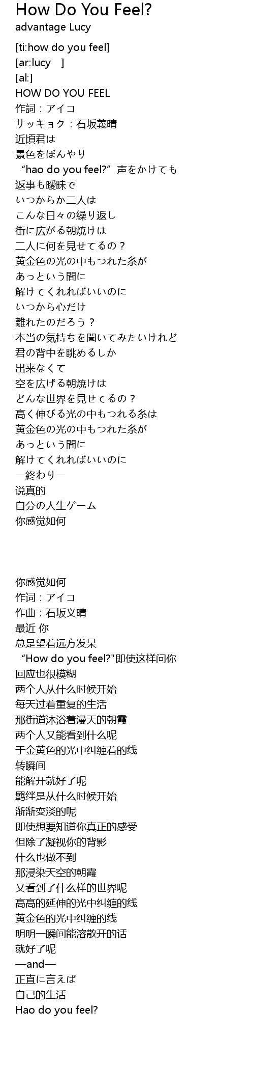 | [00:00.93] | HOW DO YOU FEEL |