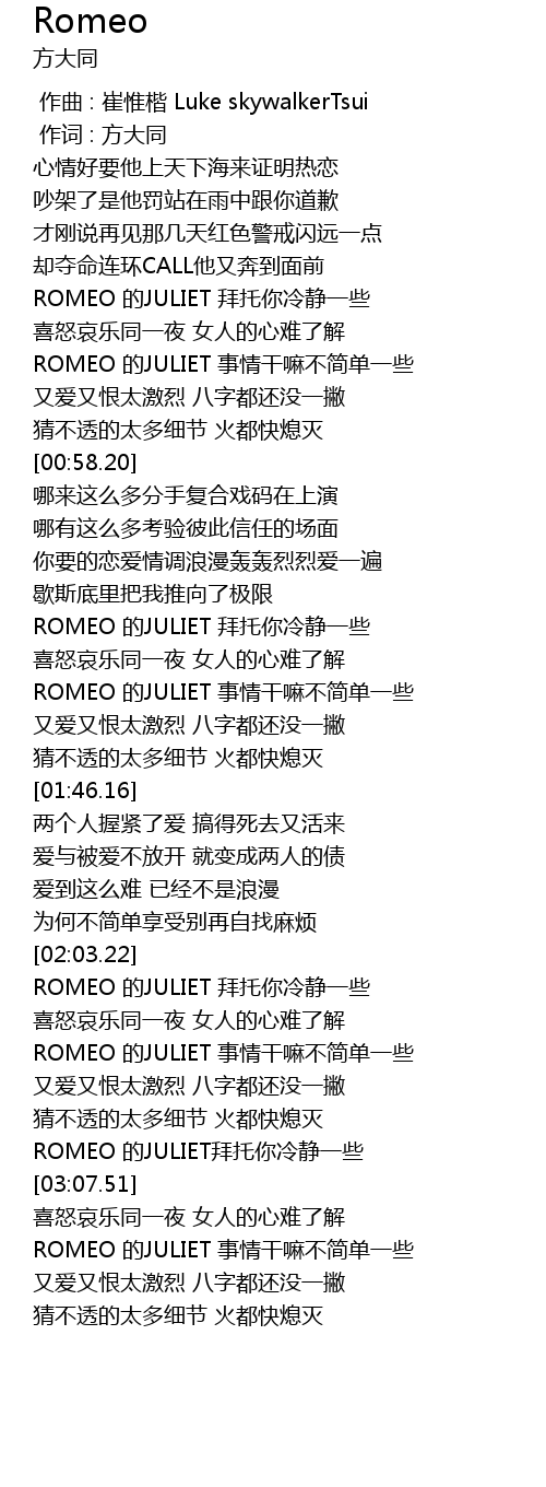 | [03:12.81] | ROMEO 的JULIET 事情干嘛不简单一些 |