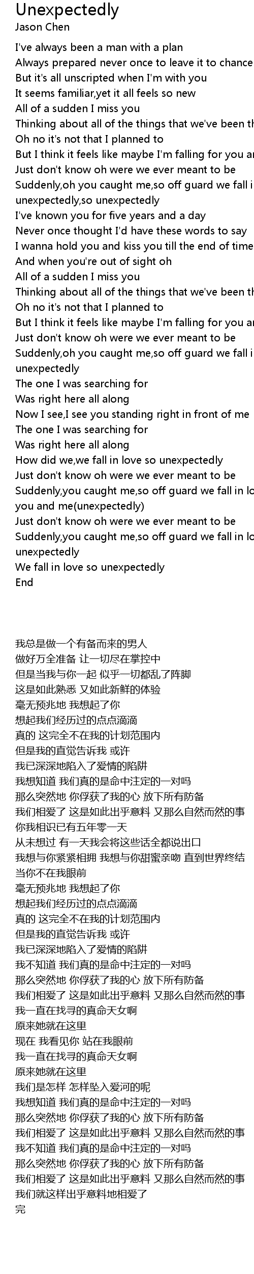 Suddenly,oh you caught me,so off guard we fall in love so unexpectedly,so unexpectedly |