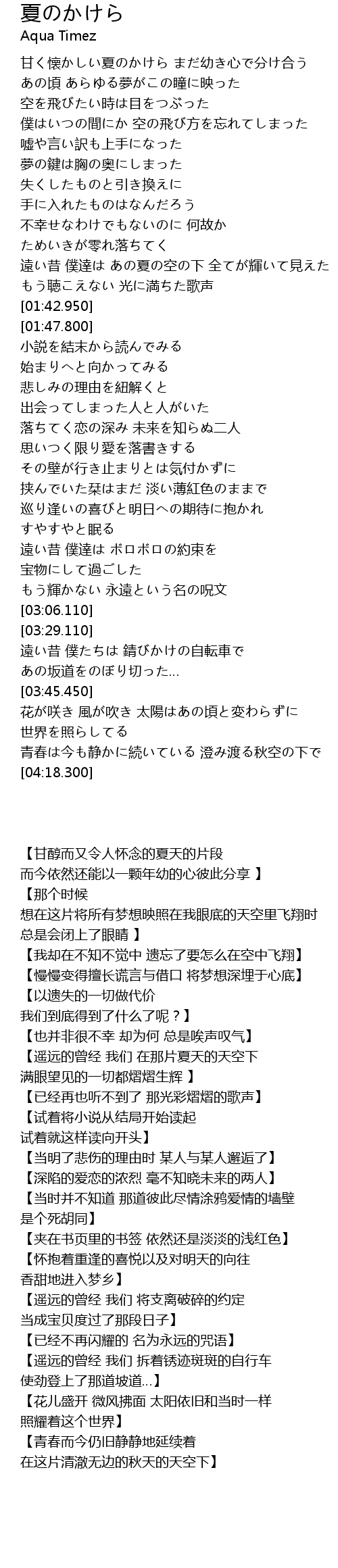 | [00:26.10] | 甘く懐かしい夏のかけら まだ幼き心で分け合う |