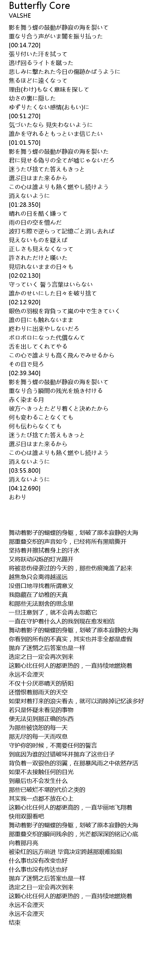 | [03:19.420] | 舞动着影子的蝴蝶的身躯,划破了原本寂静的大海 |