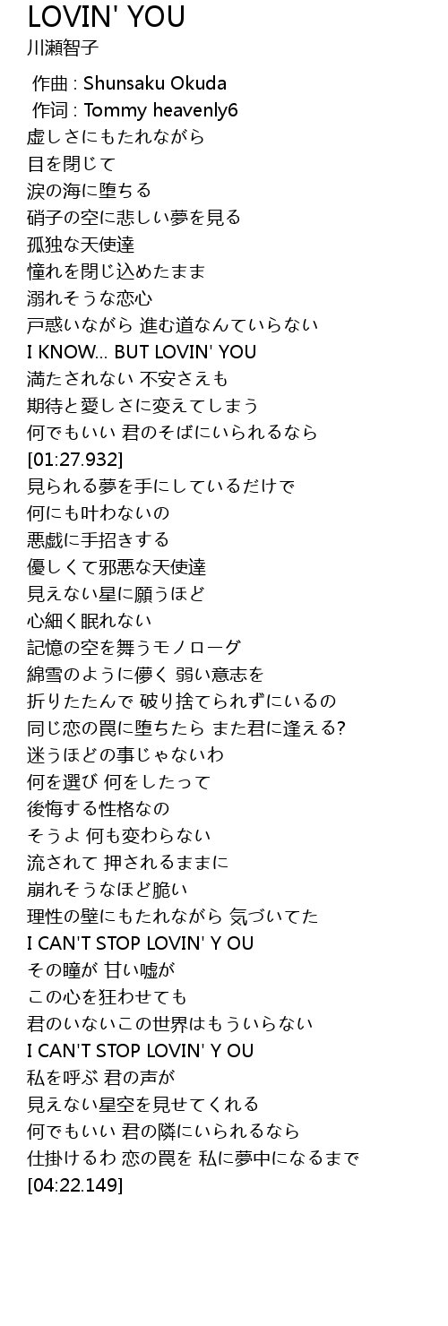 | [01:06.139] | I KNOW... BUT LOVIN' YOU |