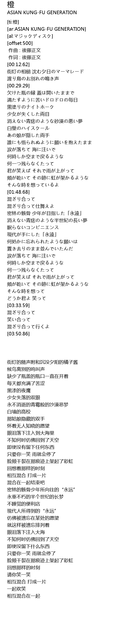 | [00:14.62] | 街灯的随声附和沉没夕阳的橘子酱 |