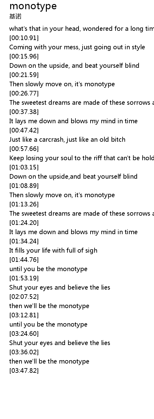 | [01:16.13] | The sweetest dreams are made of these sorrows and your tears |