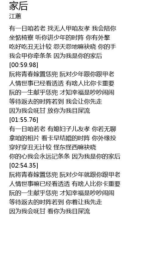 | [00:21.34] | 有一日咱若老 找无人甲咱友孝 我会陪你 |