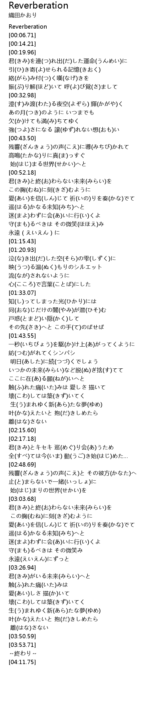 | [02:55.48] | 残響(ざんきょう)の声(こえ)と その彼方(かなた)へ |