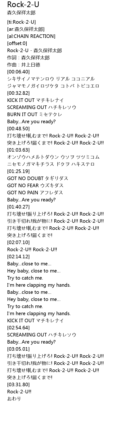 | [03:20.56] | 打ち壊せ!軋むまで! Rock-2-U!! Rock-2-U!! |