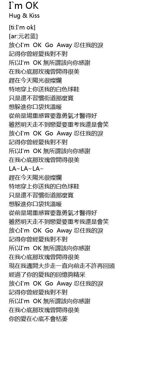 | [01:11.969] | 放心I'm OK Go Away 忍住我的淚 |