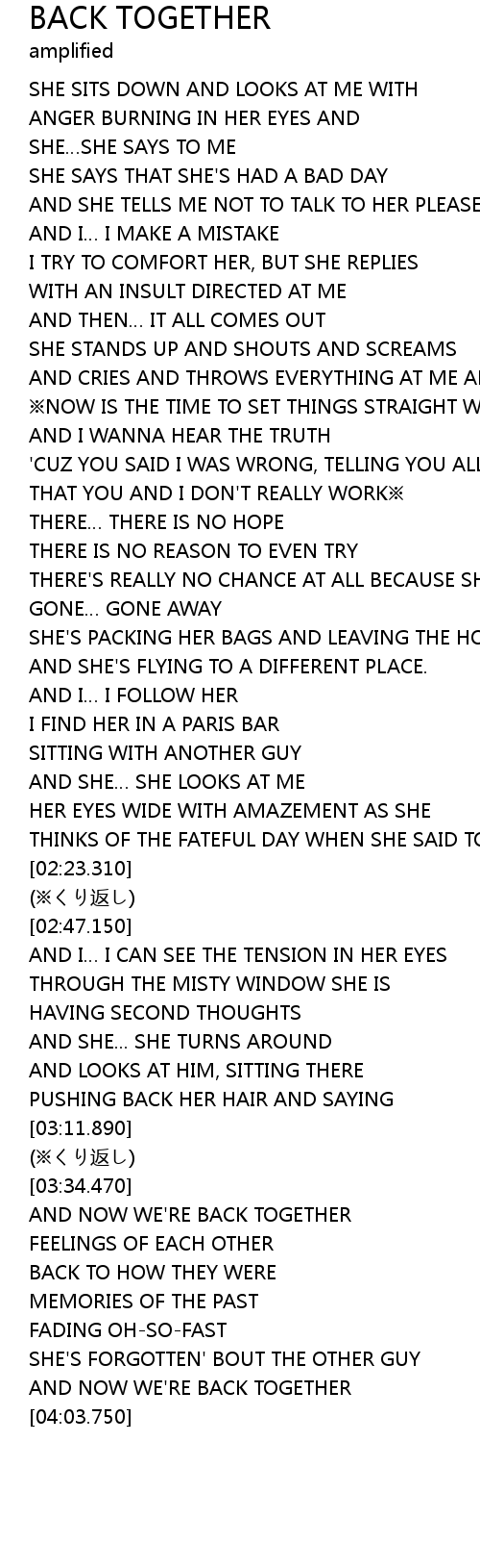 | [03:36.800] | AND NOW WE' RE BACK TOGETHER |