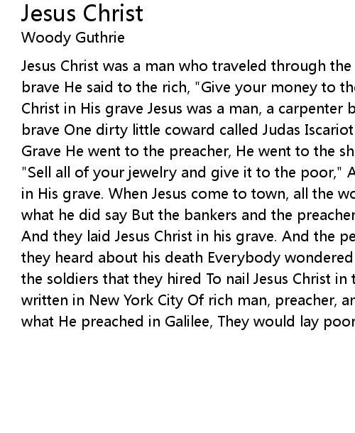Jesus Christ was a man who traveled through the land A hard-working man and brave He said to the rich, "Give your money to the poor," But they laid Jesus Christ in His grave Jesus was a man, a carpenter by hand His followers true and brave One dirty little coward called Judas Iscariot Has laid Jesus Christ in His Grave He went to the preacher, He went to the sheriff He told them all the same "Sell all of your jewelry and give it to the poor," And they laid Jesus Christ in His grave. When Jesus come to town, all the working folks around Believed what he did say But the bankers and the preachers, they nailed Him on the cross, And they laid Jesus Christ in his grave. And the people held their breath when they heard about his death Everybody wondered why It was the big landlord and the soldiers that they hired To nail Jesus Christ in the sky This song was written in New York City Of rich man, preacher, and slave If Jesus was to preach what He preached in Galilee, They would lay poor Jesus in His grave. |