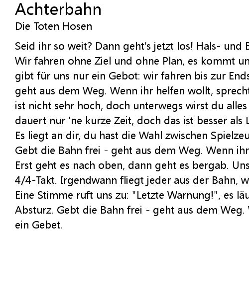 | Seid ihr so weit? Dann geht' s jetzt los! Hals und Beinbruch und Gott mit uns. Wir fahren ohne Ziel und ohne Plan, es kommt uns nur auf Geschwindigkeit an. Es gibt fü r uns nur ein Gebot: wir fahren bis zur Endstation. Gebt die Bahn frei geht aus dem Weg. Wenn ihr helfen wollt, sprecht ein Gebet. Der Eintrittspreis ist nicht sehr hoch, doch unterwegs wirst du alles andere los. Unser Glü ck dauert nur ' ne kurze Zeit, doch das ist besser als Langeweile in alle Ewigkeit. Es liegt an dir, du hast die Wahl zwischen Spielzeugkarussell und Achterbahn. Gebt die Bahn frei geht aus dem Weg. Wenn ihr helfen wollt, sprecht ein Gebet. Erst geht es nach oben, dann geht es bergab. Unser Leben fliegt vorü ber im 4 4Takt. Irgendwann fliegt jeder aus der Bahn, wir alle warten auf diesen Tag. Eine Stimme ruft uns zu: " Letzte Warnung!", es l uft der Countdown fü r den Absturz. Gebt die Bahn frei geht aus dem Weg. Wenn ihr helfen wollt, sprecht ein Gebet. |