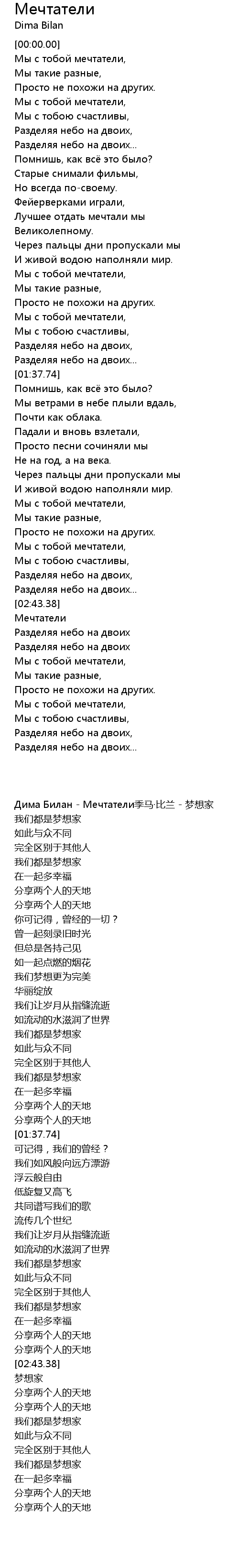 | [00:00.00] | Дима Билан - Мечтатели季马·比兰 - 梦想家 |